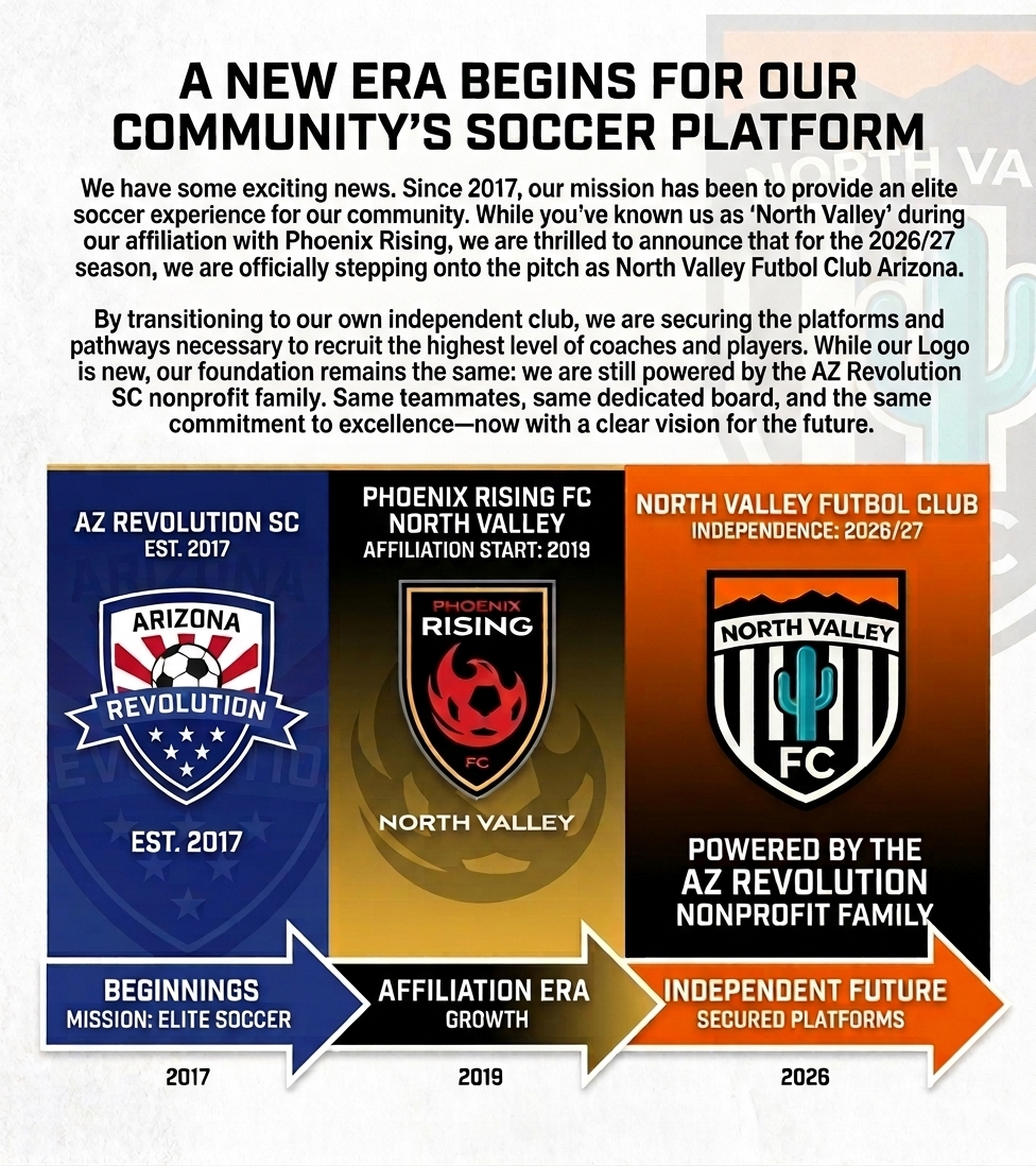 By transitioning to our own independent club, we are securing the platforms and pathways necessary to recruit the highest level of coaches and players. While our look is new, our foundation remains the same: we are still powered by the AZ Revolution SC nonprofit family. Same teammates, same Anthem practice fields, same coaching staff and the same commitment to excellence - now with a clear vision for the future.